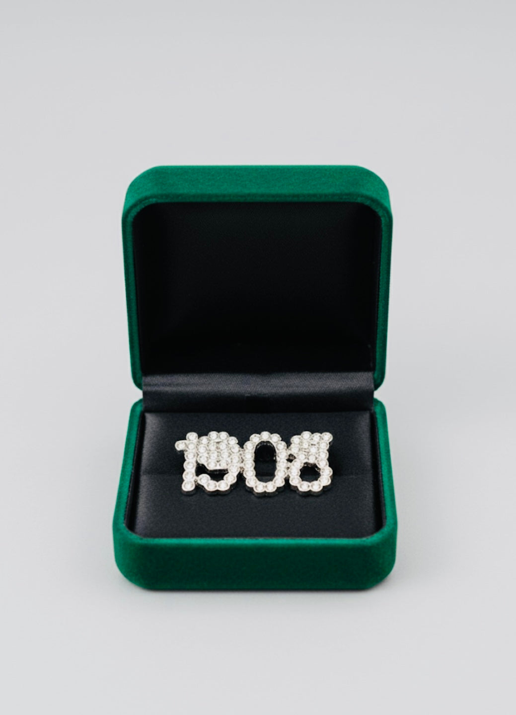 This 1908 magnetic brooch measure 1" tall x 2" wide, crafted in a silver-tone finish with your choice of sparkling rhinestones or luminous pearls. Designed with a magnet back instead of a pin, so you can proudly show your sorority style without damaging fabric. Perfect for blouses, blazers, totes, travel gear, and scarves. BOX NOT INCLUDED